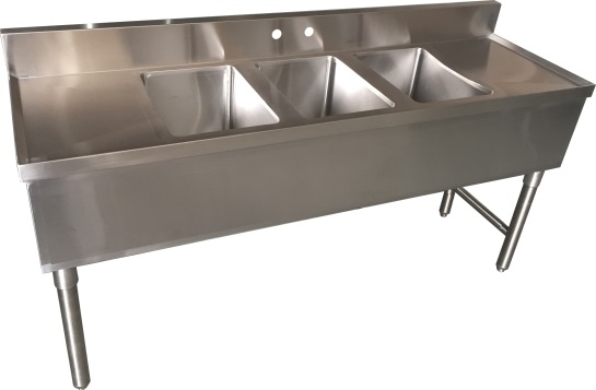 Stainless Steel Bar Sink, 3 comp., with right & left drainboard with Stainles Steel H‐Frame legs, 59″ x 18.5″ x 33″ (bowl size: 10″ x 14″ x 10″) Top and Bowl: 304 Grade/20Ga. Side Skirt: 430 Grade/20Ga. Front Skirt: 430 Grade/22Ga. Legs: 201 Grade/18Ga. . Assembly required.