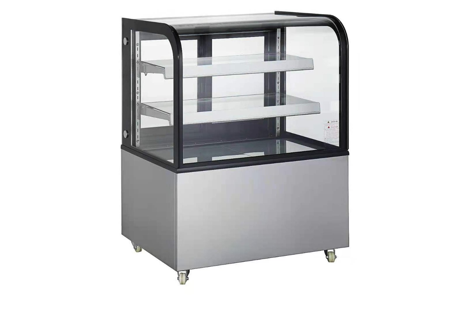 Curved Glass Refrigerated Display Case, floor model, 36″W x 26″D x 48″H, 10.4 cu.ft interior capacity, 32°F to 53.6°F temperature range, digital temperature controller & display, sliding rear glass door, (2) adjustable glass shelves, automatic defrost, internal LED lighting, stainless steel interior & exterior, bottom mounted self‐ contained refrigeration, (2) swivel & (2) swivel/brake casters, R290, 1/2 HP, 110‐ 120v/60/1‐ph. Assembly Required.