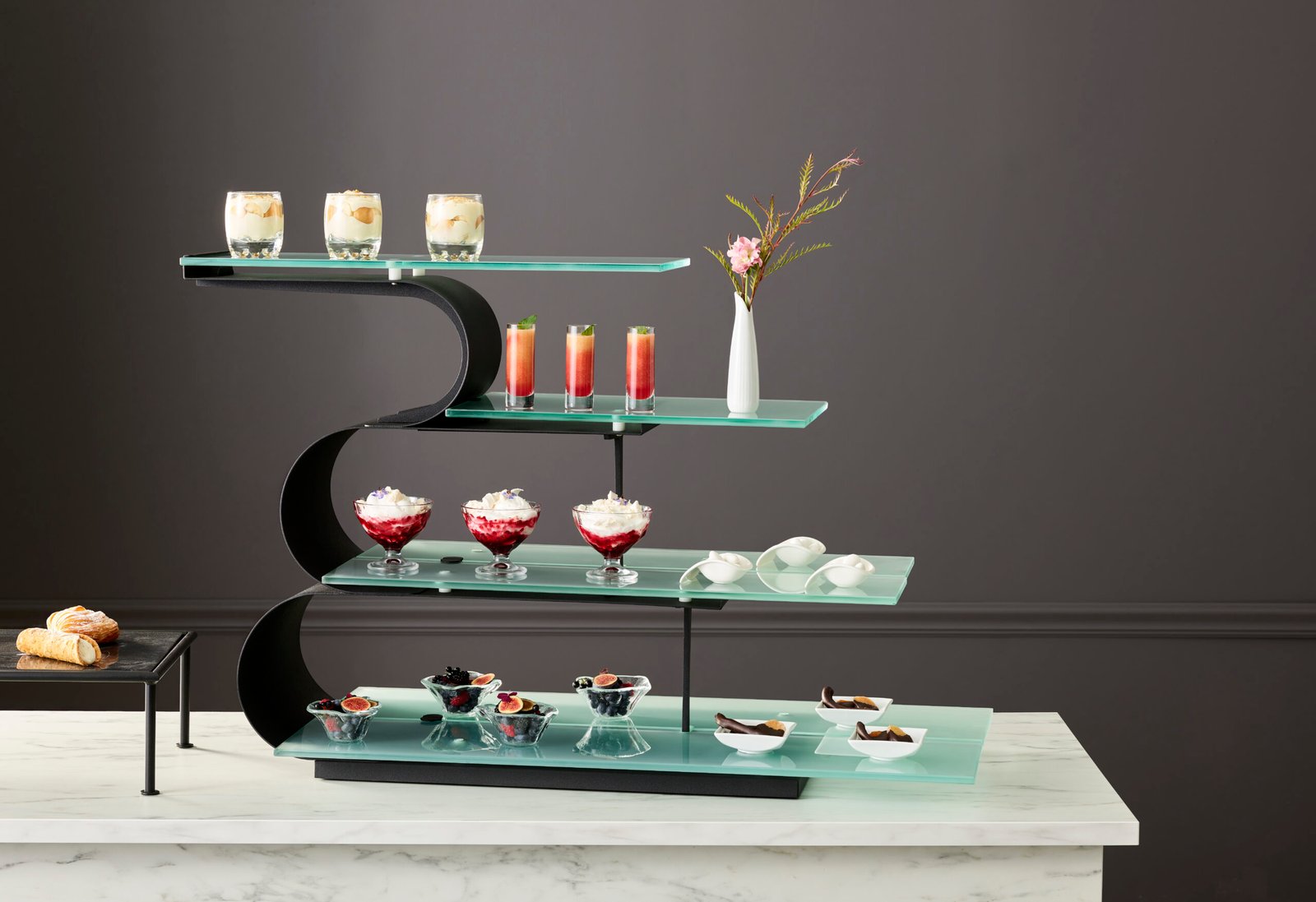 DW Haber by Steelite International takes pride in offering a tiered stand that goes beyond the ordinary. Its 4-tiered structure provides a canvas for your creativity, allowing for the display of a myriad of grab-and-go desserts, establishing a stylish back bar station for glassware, and much more. The stand’s seamless design invites a hassle-free and visually appealing arrangement of culinary delights.