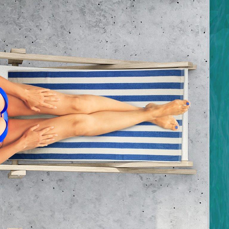 Constructed from 100% 2 Ply Ringspun Cotton Yarn, this pool towel is known for its superior absorbency and long-lasting durability. Its distinctive 2×2 classic stripe pattern in white with blue stripes is a hallmark of timeless style. The secret to its enduring charm lies in the use of VAT dyed yarn, which not only makes the colors vibrant but also ensures the towel can withstand the scorching sun rays and even harsh pool chemicals without fading.