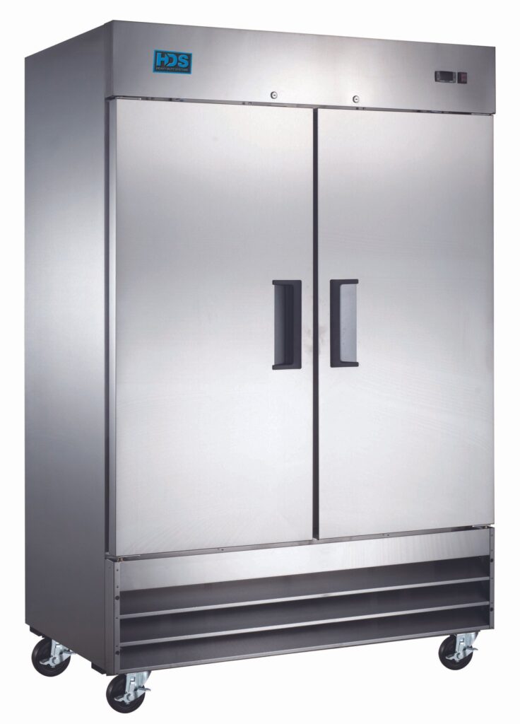 Freezer, reach‐in, two‐section, 54″ W x 32″ D x 82″ H, 47 cu. ft., slide out bottom mounted self‐contained refrigeration, front digital temperature controller with LED display, automatic defrosting,  ‐8° to 0°F temperature range, (6) adjustable plastic coated wire shelves, interior LED lighting, (2) self‐closing solid doors with recessed handles, white painted aluminum interior, 430 stainless steel exterior (4) 4″ casters (2 locking/2 non‐locking), R290, 1 HP, 115v/60/1‐ ph. Assembly Required.