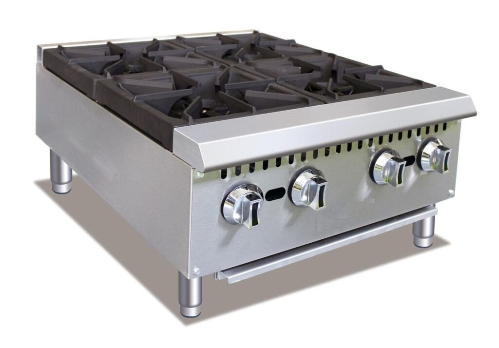 Hotplate, countertop, gas, 24″ W, (4) manual cast iron burners, stainless steel drip tray, stainless steel front and sides, adjustable legs, 100,000 BTU, 3/4? rear NPT (Set Up for LP Gas)