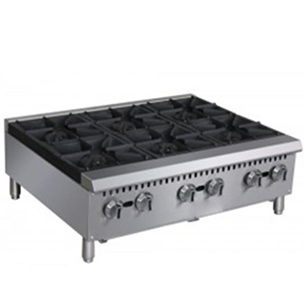 Hotplate, countertop, gas, 36″ W, (6) manual cast iron burners, stainless steel drip tray, stainless steel front and sides, adjustable legs, 150,000 BTU, 3/4? rear NPT (Set Up for LP Gas)