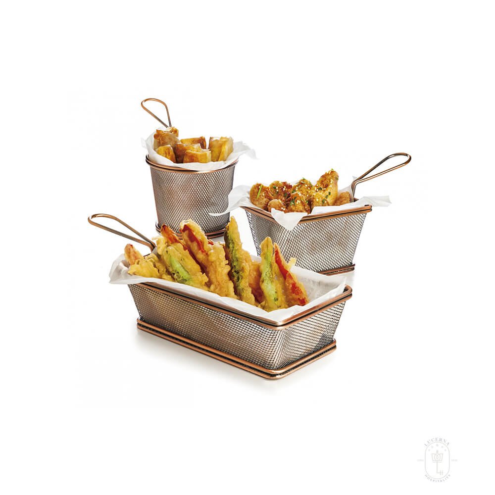 This versatile basket is designed for serving all kinds of snacks and tapas in an elegant and original way. You can choose to present your delicacies on absorbent paper within the basket or directly on the rack, depending on your preference.
