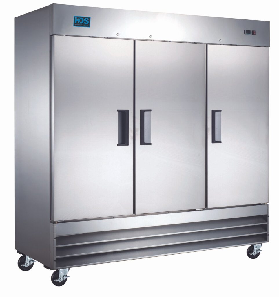 Refrigerator, reach‐in, one‐section, 81″ W x 32″ D x 82″ H, 72 cu. ft., slide out bottom mounted self‐contained refrigeration, front digital temperature controller with LED display, automatic defrosting, 33° to 41°F temperature range, (9) adjustable plastic coated wire shelves, interior LED lighting, (3) self‐closing solid door with recessed handle, white painted aluminum interior, 430 stainless steel exterior, (4) 4″ casters (2 locking/2 non‐locking), R290, 3/4 HP, 115v/60/1‐ ph. Assembly Required.