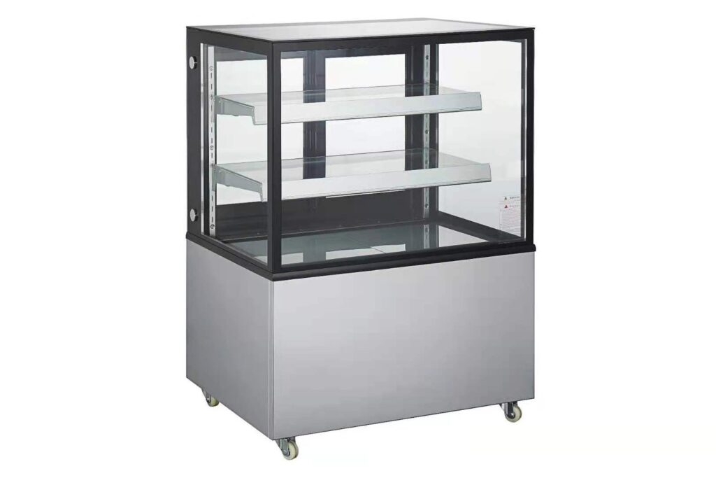 Square Glass Refrigerated Display Case, floor model, 36″W x 26″D x 48″H, 10.4 cu.ft interior capacity, 32°F to 53.6°F temperature range, digital temperature controller & display, sliding rear glass door, (2) adjustable glass shelves, automatic defrost, internal LED lighting, stainless steel interior & exterior, bottom mounted self‐ contained refrigeration, (2) swivel & (2) swivel/brake casters, R290, 1/2 HP, 110‐ 120v/60/1‐ph. Assembly Required.