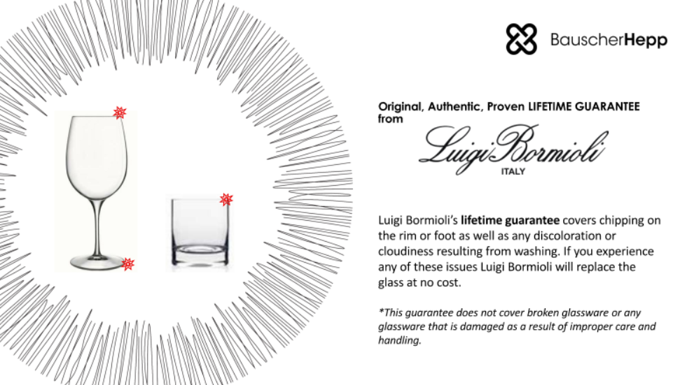 Luigi Bormioli’s lifetime guarantee covers chipping on the rim or foot, as well as any discoloration or cloudiness resulting from washing. Should you experience any of these issues, Luigi Bormioli will replace the glass at no cost. This guarantee does not cover broken glassware or damage caused by improper care and handling.